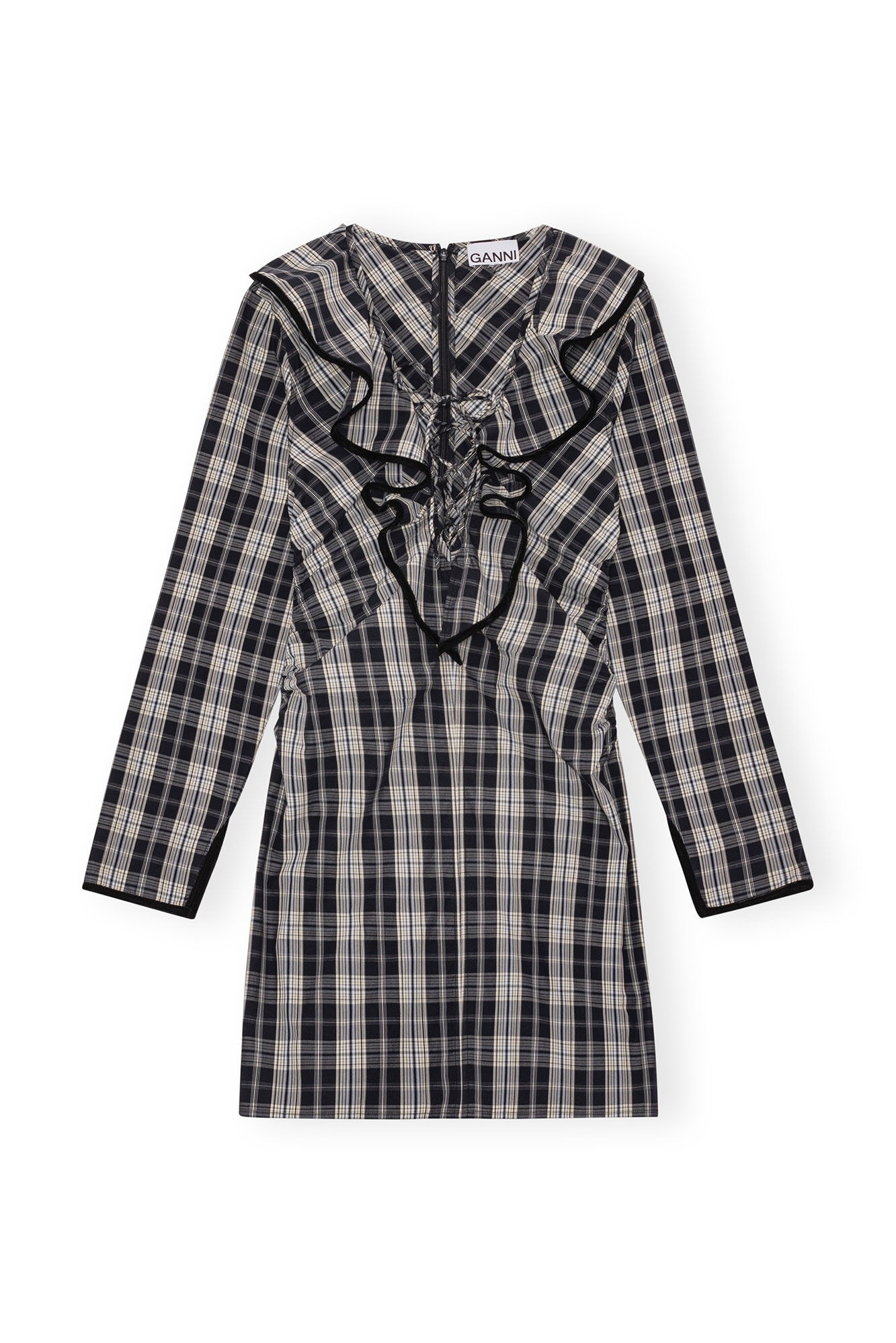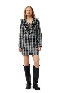 This Checkered Cotton Ruffle V-neck Mini Dress is designed for a slim fit and features a V-neckline with ruffle detailing, a tie string, long sleeves and a zip closure at the back. DETAILS - 100% organic cotton - V-neckline with ruffle detailing - Tie string - Long sleeves - Zip closure at the back Made in: India Product ID: F8749 SIZE & FIT - Designed for a slim fit throughout, skimming the body without clinging - Fits true to size, take your normal size - Lightweight, soft cotton fabric - Sabine is 5’10” and wears a size US 4