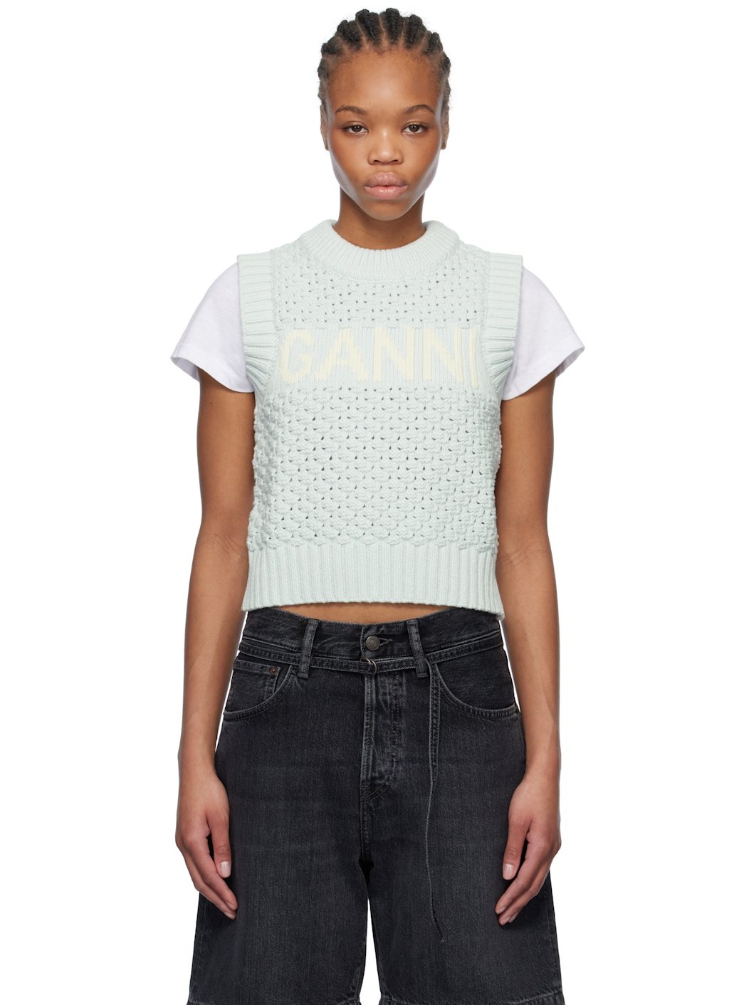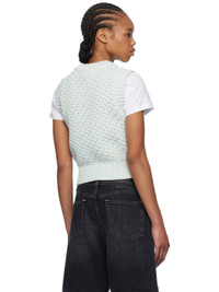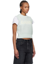 Open-knit organic cotton-blend vest. · Rib-knit crewneck, hem, and armscyes · Intarsia logo at chest Supplier color: Illusion blue