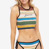 Channel all the beachy vibes with these bright crocheted bikini bottoms from GANNI. Crafted from soft organic cotton, they feature a bold striped pattern in vibrant shades of acid green, brown and orange and get finished with delicate string ties at the side. - 100% Organic Cotton - Crocheted - String Tie Closure