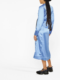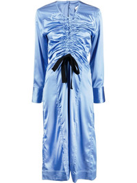 satin midi dress Based in Copenhagen, GANNI is a fashion brand mostly known for its simple and effortlessly chic style. Constructed in blue satin, this midi dress features a straight cut enhaced by a drawstring pull at the front. Highlights - Blue - Recycled polyester blend - Drawstring fastening - Round neck - Long sleeves - Mid-length Imported Composition Outer: Recycled Polyester 97%, Spandex/Elastane 3% Lining: Polyester 100% SIZE & FIT Model measurements Height 5 ft 10 in(1.78 m) Bust/Chest 30.31 in(77 cm) Hips 36.61 in(93 cm) Waist 24.8 in(63 cm) Measurement HIPS 39.37 in(100 cm) LENGTH 50 in(127 cm) WAIST 29.13 in(74 cm) FittingInformation This piece fits true to size. We recommend you get your regular size Designed for a close fit at the bust and waist, but loose at the hip Made with a mid-weight stretch fabric Washing instructions Machine Wash
