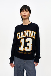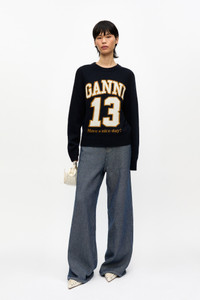 This Dark Blue Graphic Wool Mix Baseball Sweater features a round neckline, a graphic GANNI motif, long sleeves and ribbed edges. DETAILS - 45% wool, 35% recycled wool, 20% recycled polyamide. Learn more about our materials - Round neckline - Long sleeves - Ribbed edges - Graphic GANNI motif Made in: Romania Product ID: K2427 SIZE & FIT - Jenny is 5’10” and wears a size S