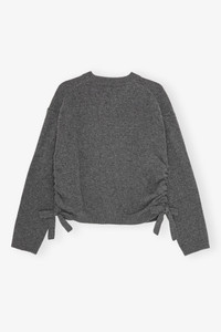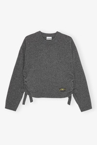 This jumper features a round neckline and long sleeves. The jumper has side tie details for adjustable styling and ribbed cuffs and neckline for a classic finish. This knit contains Viscose made with CIRCULOSE®, a next-gen material that is part of our Fabrics of the Future initiative. Learn more in our Material Index. DETAILS - 60% recycled wool, 40% viscose (with CIRCULOSE®). Learn more about our materials - Round neckline - Long sleeves - Ribbed edges - GANNI logo patch Made in: Romania Product ID: K2569 SIZE & FIT - Oversized fit - For personalised guidance on sizing and fit, contact our Customer Service team - here - .