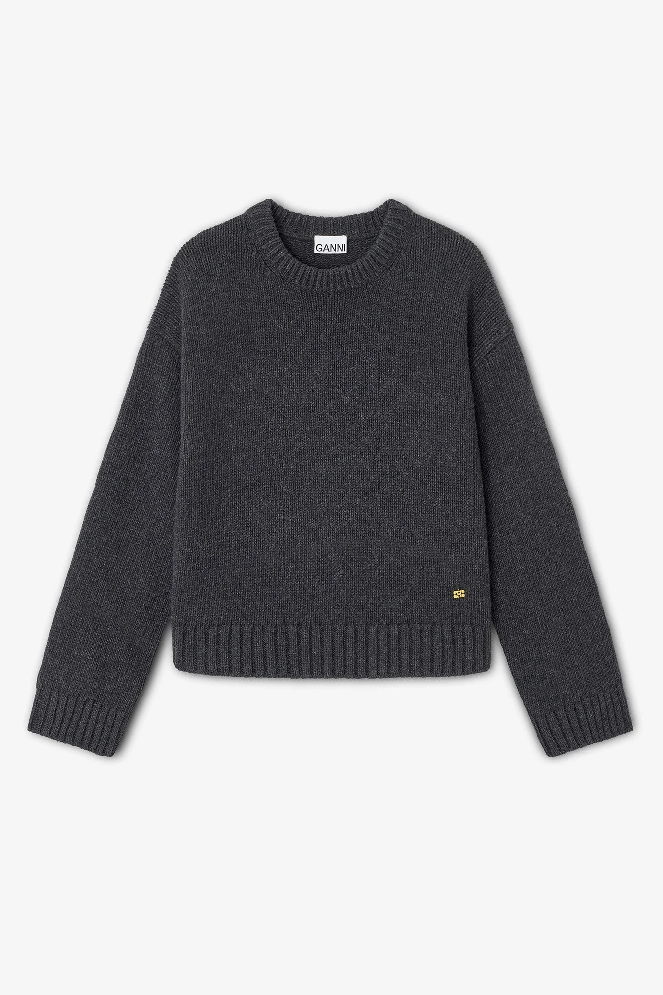 This sweater features a round neckline, long sleeves, ribbed edges and a GANNI Butterfly logo. DETAILS - 45% wool, 35% recycled wool, 20% recycled polyamide. Learn more about our materials - Round neckline - Long sleeves - Ribbed edges - Gold-tone GANNI Butterfly logo Made in: Romania Product ID: K2610 SIZE & FIT - Regular fit - Ayesha is 5’9” and wears a size S/M - For personalised guidance on sizing and fit, contact our Customer Service team - here - .