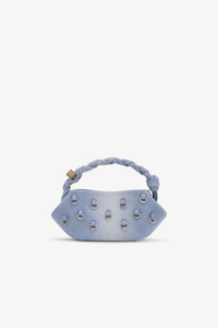 This Denim Charms Mini GANNI Bou Bag features a tone-on-tone metallic GANNI Butterfly logo, a twisted handle with a braided knot, and a gold-tone metallic dice with a GANNI Butterfly logo engraved. The bag has an internal magnetic closure, a flat card pocket inside, and an adjustable and removable shoulder strap for crossbody wear with metallic eyelets. DETAILS - 100% recycled cotton. Learn more about our materials - Lining composition: 65% recycled cotton, 35% cotton - Twisted handle with a braided knot - Adjustable and removable shoulder strap - Metallic dice with a GANNI and Butterfly logo engraved - Tone-on-tone GANNI Butterfly logo - One compartment - Flat card pocket inside - Internal magnet closure - GANNI embossed logo on the back - Metallic eyelets Made in: China Product ID: A6512 SIZE & FIT - Strap length: 50 - Height: 11 - Width: 25 - Depth: 11.5