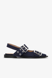 These Denim Feminine Buckle Ballerinas feature slingback straps and a pointed toe. The shoes have two silver-tone buckles with matching eyelets and a black squared block heel. DETAILS - 100% recycled cotton. Learn more about our materials - Lining composition: 76% Polyurethane 24% Viscose - Slingback straps - Pointed toe - Two silver-tone buckles with eyelets - Black squared block heels Made in: Portugal Product ID: S2797 SIZE & FIT - Fits true to size, take your normal size
