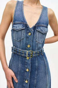 This Blue Light Denim Belt Midi Dress is sleeveless and features a V-neck, button closure, front flap pockets and a matching belt with metallic eyelets. DETAILS - 100% TENCEL™ Lyocell. Learn more about our materials - V-neckline - Sleeveless - Button closure at the front - Front flap pockets - Matching belt - Metallic eyelets Made in: Tunisia Product ID: J1728 SIZE & FIT - Xia is 5’9” and wears a size US 4