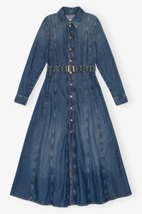 This Dark Blue Denim Maxi Dress features a pointed collar and a button-front closure that runs the length of the dress. It has long sleeves with buttoned cuffs and comes with a belt with gold-toned eyelets that defines the waist. DETAILS - 64% organic cotton, 36% TENCEL™ Lyocell. Learn more about our materials - Pointed collar - Long sleeves with buttoned cuffs - Button closure at the front Made in: Tunisia Product ID: J1611 SIZE & FIT - Regular fit - Zoey is 5’10” and wears a size S