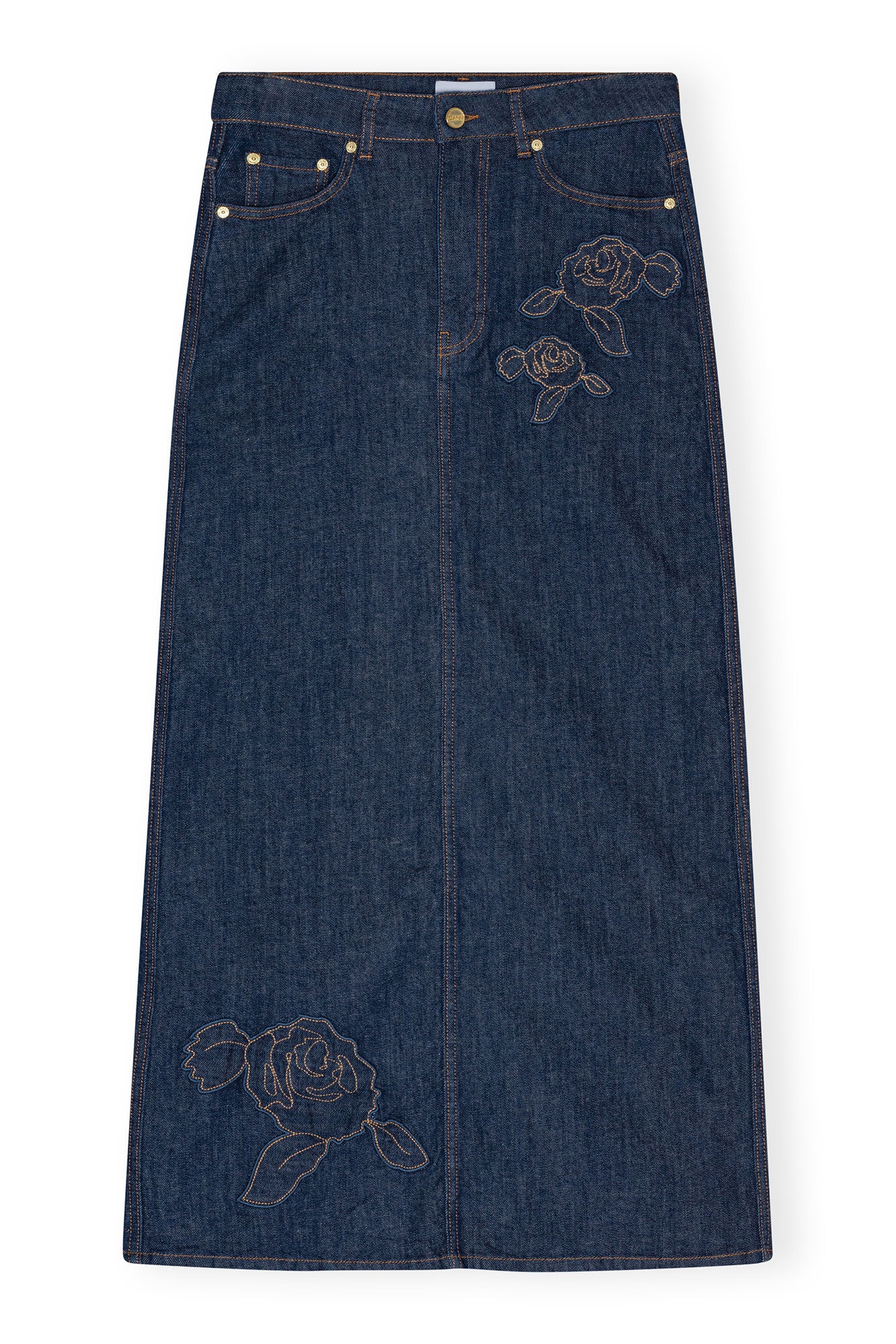 This Denim Rose Maxi Skirt is designed for a slim fit and features a 5-pocket style with a zip and button closure, belt loops, GANNI logo at the back pocket, stitched rose artwork and a high slit at the front and back. DETAILS - 99% organic cotton, 1% elastane. Learn more about our materials - Zip and button closure - Belt loops - GANNI logo at the back pocket - Stitched rose artwork - High slit at the front and back Made in: Turkey Product ID: J1440 SIZE & FIT - Designed for a slim fit at the waist and through the hips - Fits true to size, take your normal size - Mediumweight, stretchy denim - Tonia is 5’9” and wears a size US 4