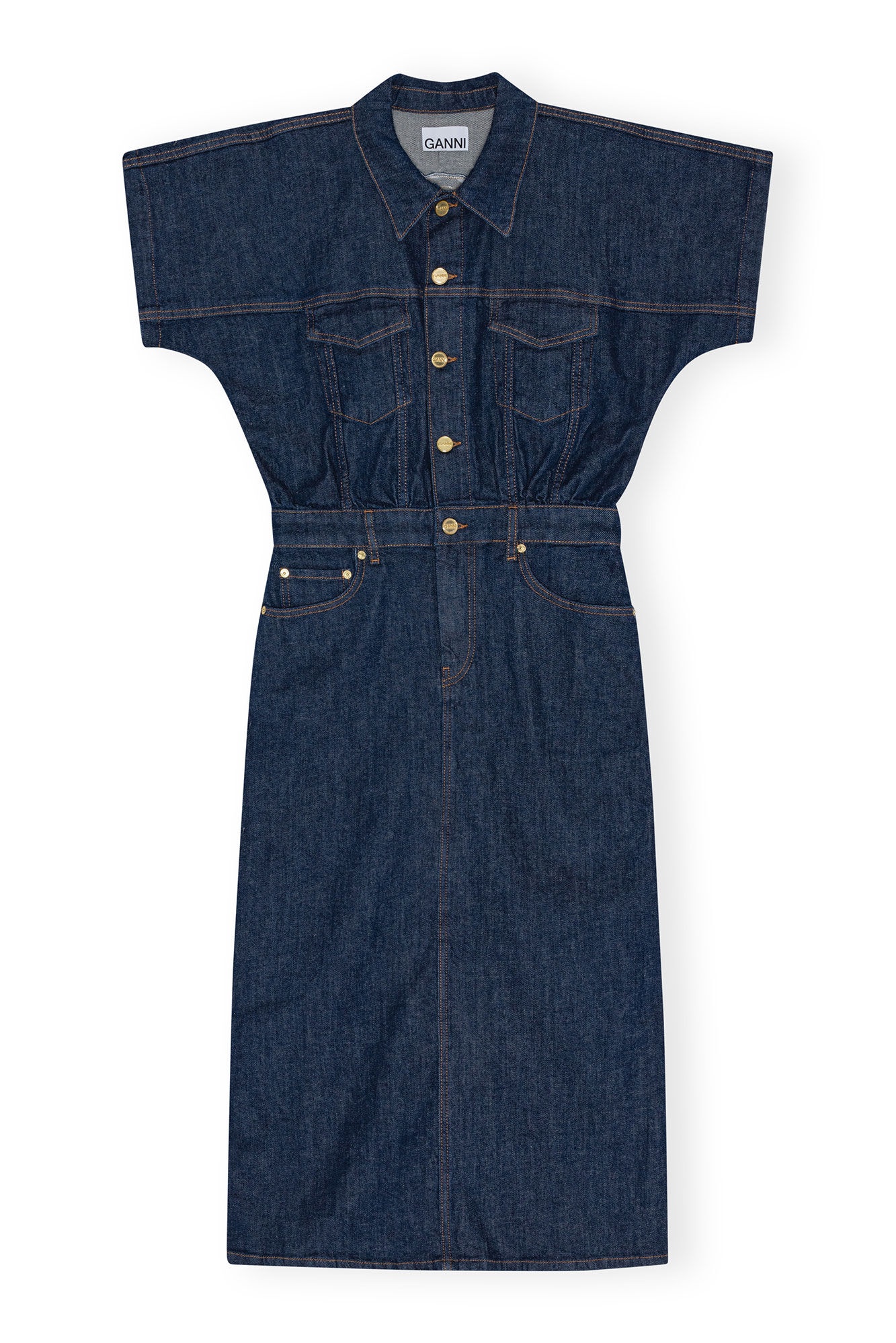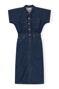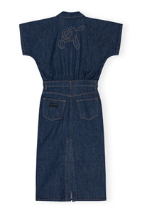 This Denim Rose Midi Dress is designed for a regular fit at the top with a fitted skirt. The dress features a collar, button closure, short sleeves, front pockets, high slit at the back and a stitched rose artwork at the back. DETAILS - 99% organic cotton, 1% elastane. Learn more about our materials - 5-pocket style with belt loops and zip closure - GANNI logo on the back pocket - Collar - Button closure - Short sleeves - Front pockets - High slit at the back - Stitched rose artwork at the back Made in: Turkey Product ID: J1439 SIZE & FIT - Designed for a regular fit with a fitted skirt - Fits true to size, take your normal size - Mediumweight, stretchy denim - Julie is 5’11” and wears a size US 4