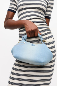 This Denim Small GANNI Bou Bag features a tone-on-tone metallic GANNI Butterfly logo, a twisted handle with a braided knot, and a gold-tone metallic dice with a GANNI Butterfly logo engraved. The bag has an internal magnetic closure, a flat card pocket inside, multiple pockets and an adjustable and removable shoulder strap for crossbody wear. DETAILS - 100% recycled cotton. Learn more about our materials - Lining composition: 65% recycled cotton, 35% cotton - Twisted handle with a braided knot - Adjustable and removable shoulder strap - Back pocket - Front pockets - Tone-on-tone GANNI Butterfly logo - Metallic dice with a GANNI and Butterfly logo engraved - Flat card pocket inside - Internal magnet closure Made in: China Product ID: A6497 SIZE & FIT - Strap length: 50 - Height: 14 - Width: 28 - Depth: 17