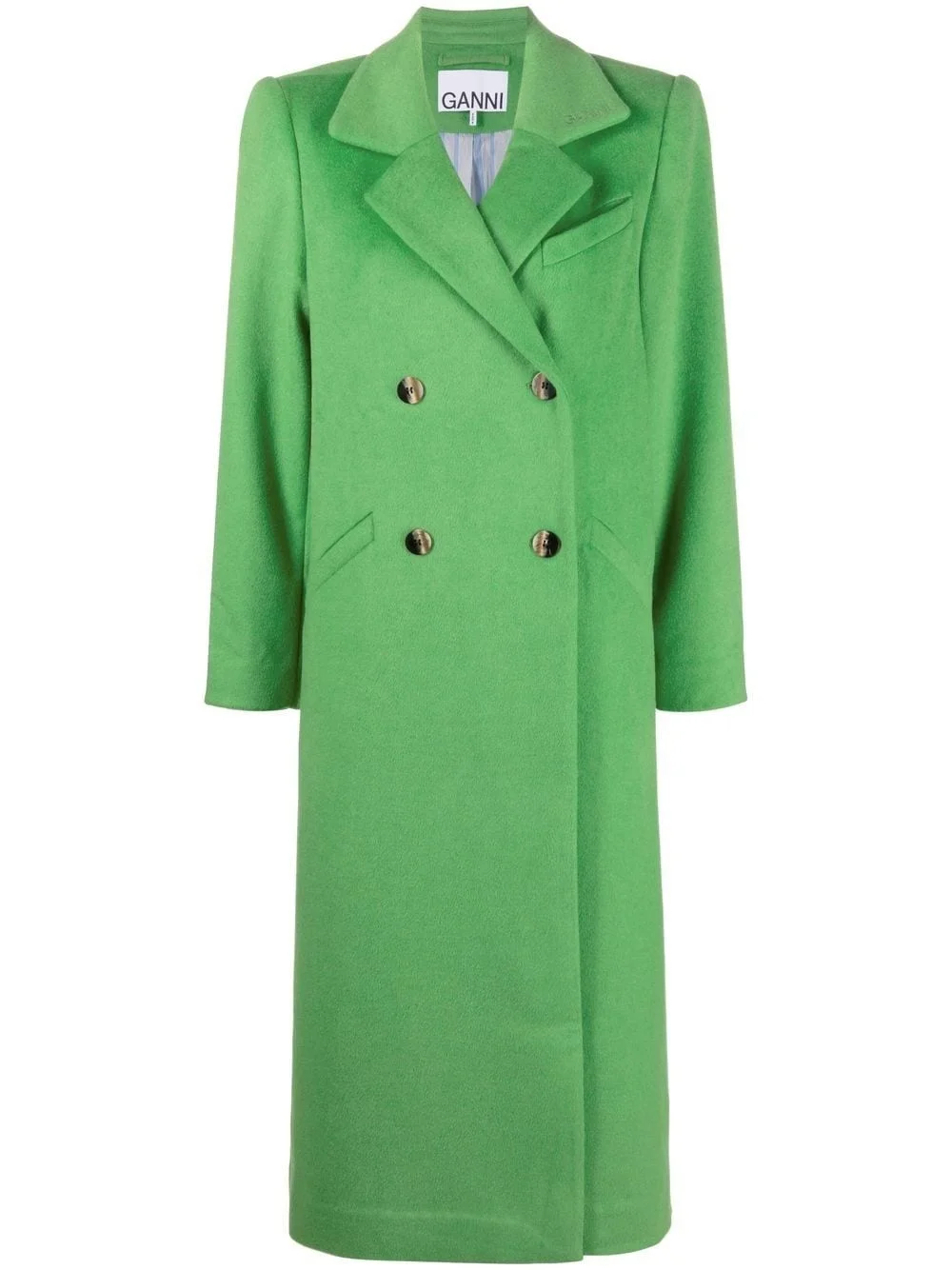 double-breasted button-fastening coat Ganni's balance of creative style and minimalist design is showcased on this double-breasted coat which has a classic tailored construction, presented in a contemporary bright green hue. Highlights - Green - Wool - Notched lapels - Long sleeves - Front button fastening - Two side slit pockets Imported Composition Outer: Polyester 50%, Recycled Wool 50% Lining: Recycled Polyester 100% SIZE & FIT Model measurements Height 5 ft 10 in(1.78 m) Bust/Chest 31.49 in(80 cm) Hips 35.03 in(89 cm) Waist 23.62 in(60 cm) Measurement SLEEVE LENGTH 24.4 in(62 cm) LENGTH 48.03 in(122 cm) FittingInformation This piece fits true to size. We recommend you get your regular size Cut for a loose fit Made with a mid-weight non-stretch fabric Washing instructions Dry Clean Only