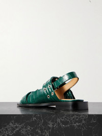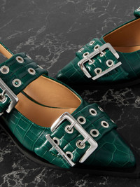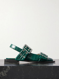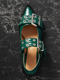 GANNI's slingback flats are the perfect way to toughen up a romantic dress. Crafted from glossy recycled synthetic material, they have eyelet-embellished buckled straps and sleek pointed toes. Size & Fit - Fits true to size, take your normal size - Only available in full sizes, go up to the nearest whole size if you take a half size - Italian sizing Details & Care - Heel measures approximately 25mm/ 1 inch - Jade glossed recycled synthetic material - Elasticated slingback strap