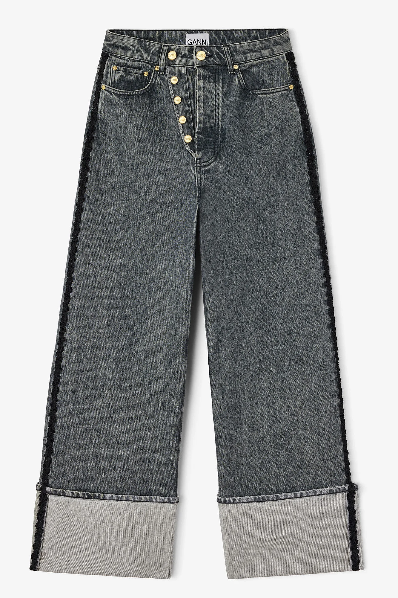 Mid/Low-rise jeans with a dropped crotch and a wide baggy leg. Style has a double button closure, making it possible to wear the jeans as mid or low rise. Crafted from grey washed non stretch denim, featuring high turn up hems and decorative black lace tape. DETAILS - 100% Organic Cotton Learn more about our materials - Grey washed - Length: Full - Waist: Low - Closure: Zipper - Silhouette: Wide - Fabric: Rigid - Lace edges seam detail Made in: Turkey Product ID: A1100030 SIZE & FIT - Oversized fit - Lilli-zoe is 5’9” and wears a size 27W / 33L