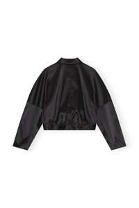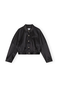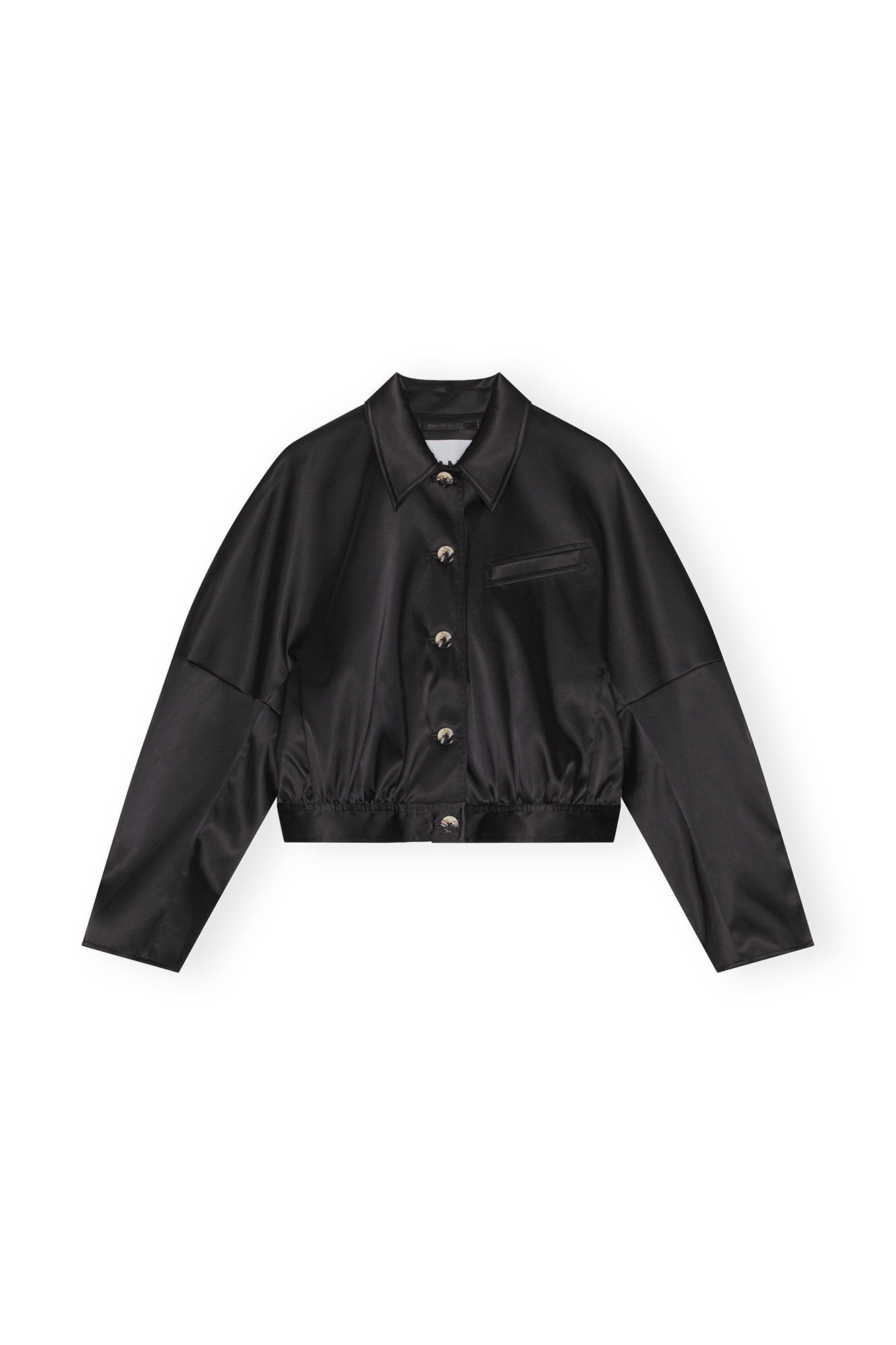 This Double Satin Short Jacket is made from recycled polyester. The jacket is designed for a relaxed fit and features a collar, button closure and decorative pocket at the front. DETAILS - 91% recycled polyester, 9% elastane - Collar - Button closure - Decorative pocket at the front Made in: China Product ID: F8133 SIZE & FIT - Designed for a relaxed fit on the shoulders and a box fit through the body - Take your normal size to achieve the model's look, those in between sizes or with a smaller frame might consider taking a size down - Mediumweight, shiny satin fabric with stretch - Victoria is 5’11” and wears a size US 4 - Gaia is 5’5” and wears a size US 2 - Julie is 5’11” and wears a size US 4