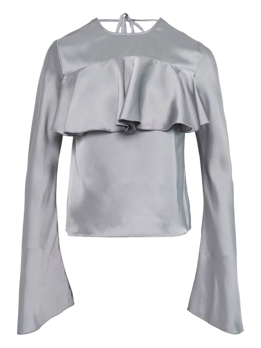 ruffled long-sleeved blouse Highlights - Grey - Satin finish - Ruffle detailing - Long sleeves - Tie fastening - Round neck Imported Composition Viscose 100% Washing instructions Read Manufacturer Guidelines