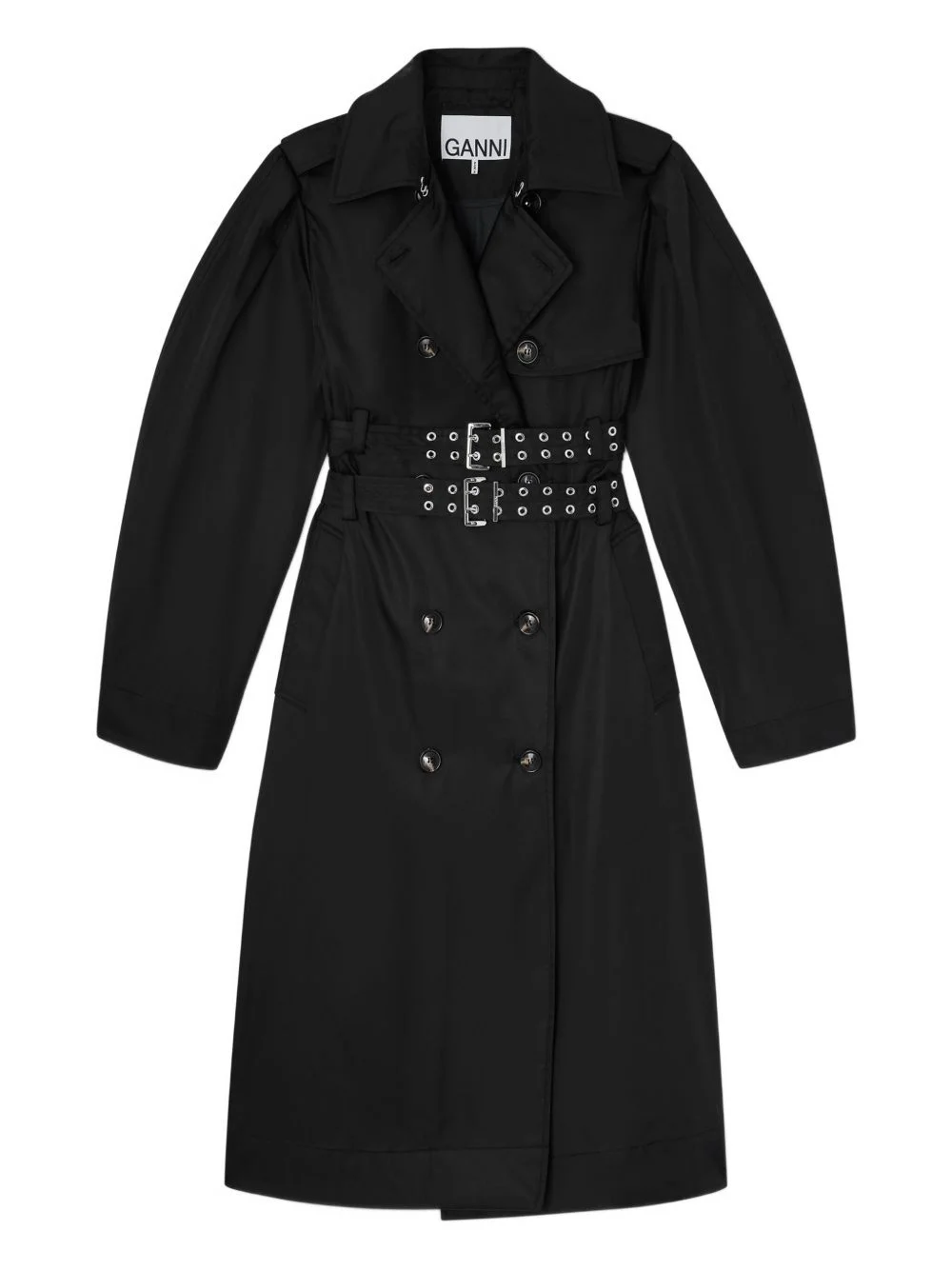 belted double-breasted coat Highlights - Black - Double-breasted - Belt - Eyelet embellishment - Button fastening - Ruffled collar Imported Composition Fabric 100% Washing instructions Read Manufacturer Guidelines