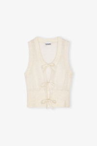 This Off-White Tie String Vest features an open round neckline with tie bands, ribbed edges and an embroidered GANNI logo. DETAILS - 55% mohair, 29% recycled nylon, 16% merino. Learn more about our materials - Open round neckline with tie bands - Ribbed edges - Embroidered GANNI logo Made in: China Product ID: K2513 SIZE & FIT - Marimar is 5’9” and wears a size S