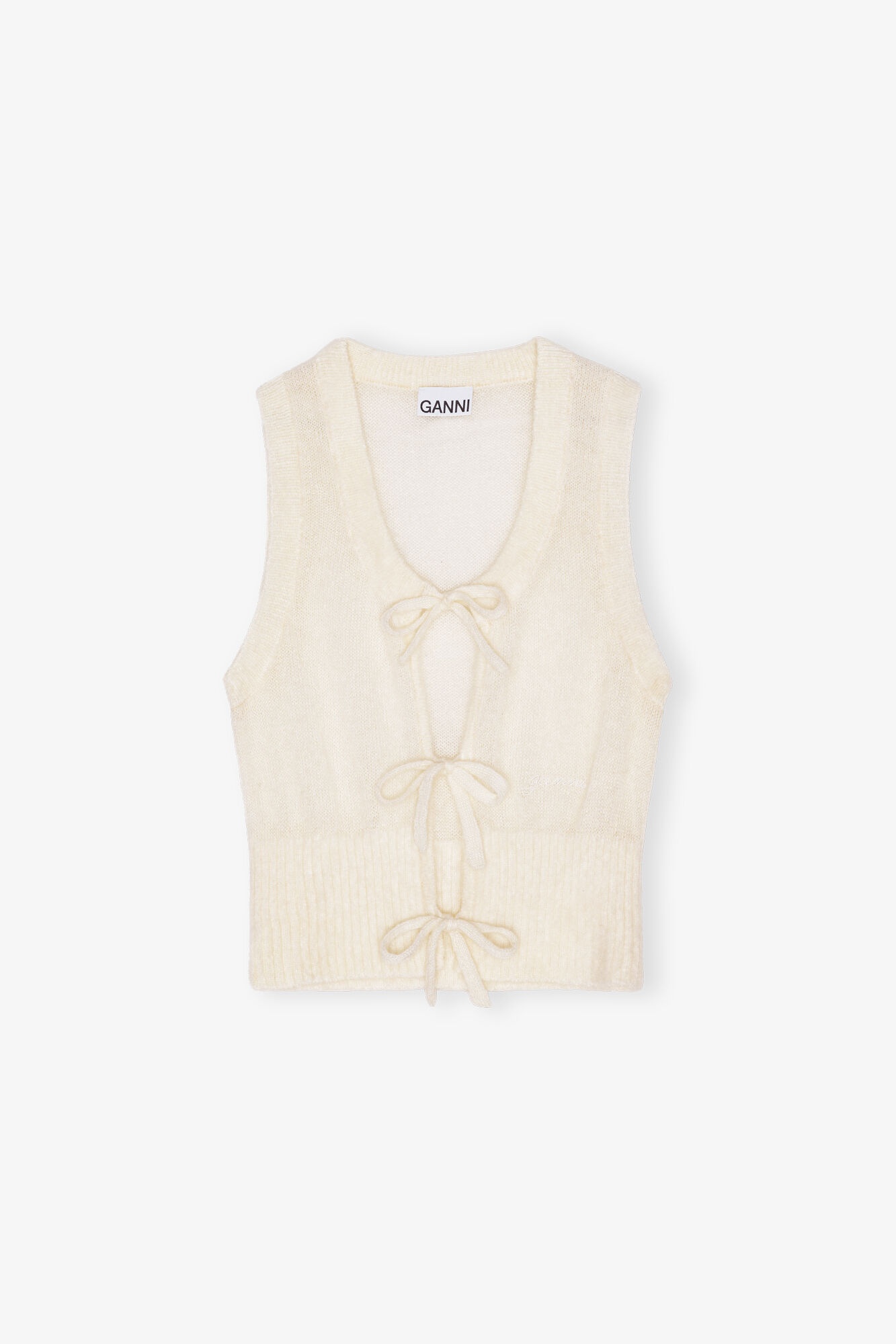 This Egret Tie String Vest features an open round neckline with tie bands, ribbed edges and an embroidered GANNI logo. DETAILS - 55% mohair, 29% nylon, 16% merino. Learn more about our materials - Open round neckline with tie bands - Sleeveless - Ribbed edges - Embroidered GANNI logo Made in: China Product ID: K2334 SIZE & FIT - Designed for a regular fit - Fits true to size, take your normal size - Regular fit - Marimar is 5’9” and wears a size S