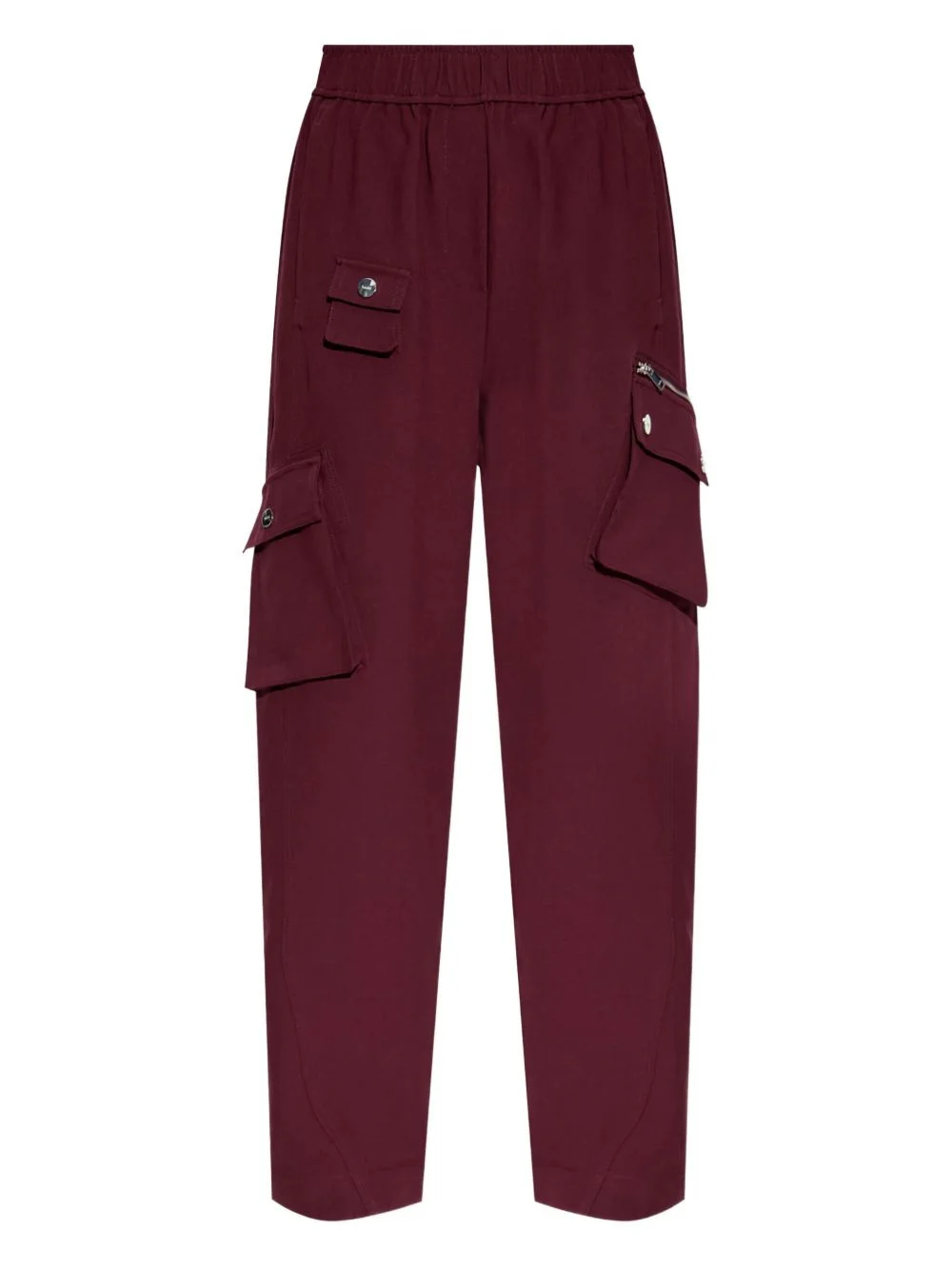 elasticated-waistband jeans Highlights - Burgundy - Cargo pockets - Elasticated waistband - Zip fastening - Flap pockets - Curved seams Imported Composition Polyester 74%, Viscose 23%, Spandex/Elastane 3% Washing instructions Read Manufacturer Guidelines