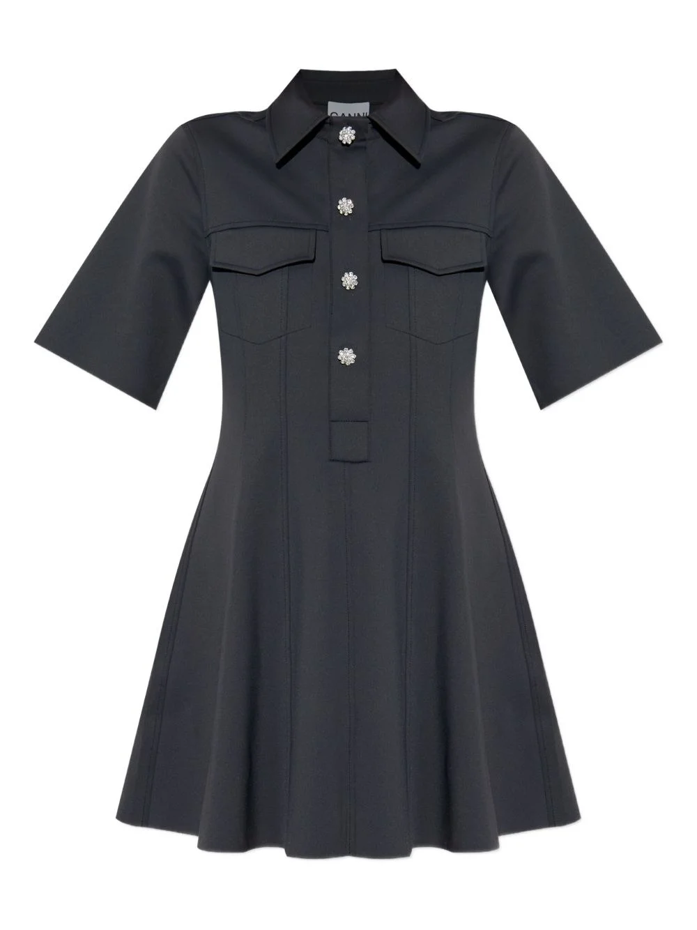 embellished short-sleeved mini day dress Highlights - Black - Short sleeves - Collared neckline - A-line skirt - Embellished button front fastening Imported Composition Recycled Polyamide 100% Washing instructions Read Manufacturer Guidelines
