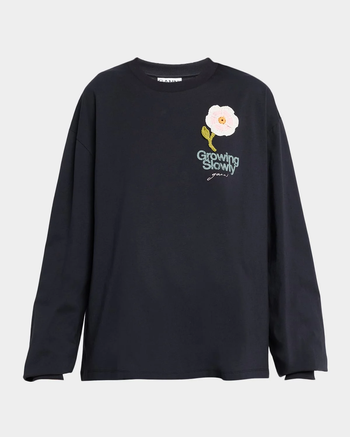 Ganni classic cotton-jersey tee accented with floral logo embroidery & nbsp; Crew neckline Dropped shoulders Long sleeves & nbsp; Relaxed fit Hem falls to the hip Pullover style & nbsp; Cotton Hand wash or dry clean Made in Portugal SIZE & FITModel measurements: 5 & apos;10" tallModel is wearing a US size 4/Small