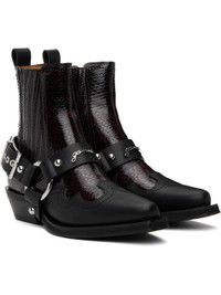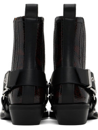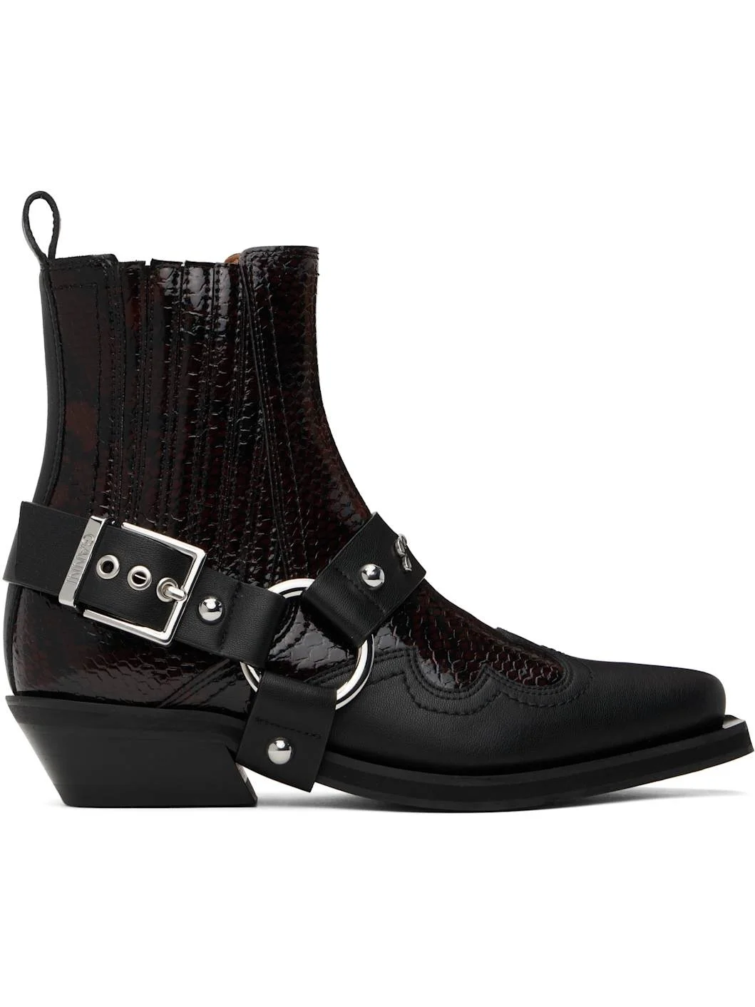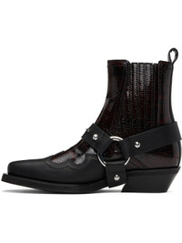 Ankle-high snake-embossed and grained faux-leather boots in burgundy and black. · Pointed toe · Detachable harness-style overlay · Embroidered detailing at vamp · Logo hardware at vamp · O-ring and elasticized gusset at sides · Pin-buckle fastening at outer side · Pull-loop at heel collar · Buffed faux-leather lining · Stacked faux-leather heel with rubber injection · Rubber sole · Logo-engraved silver-tone hardware · Heel: H1.5" Supplier color: Black/Dark burgundy Upper: synthetic. Sole: rubber. Made in Portugal 251144F113002