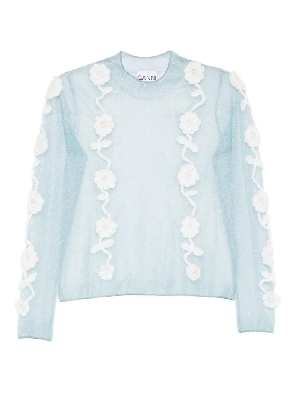 floral-applique blouse Highlights - Cyan blue - Floral applique - Round neck - Long sleeves Made in Italy Composition Recycled Polyamide 56%, Mohair 28%, Polyester 8%, Wool 8% SIZE & FIT Model measurements Height 5 ft 8 in(1.73 m) Bust/Chest 29.92 in(76 cm) Hips 33.07 in(84 cm) Waist 23.22 in(59 cm) Washing instructions Machine Wash