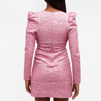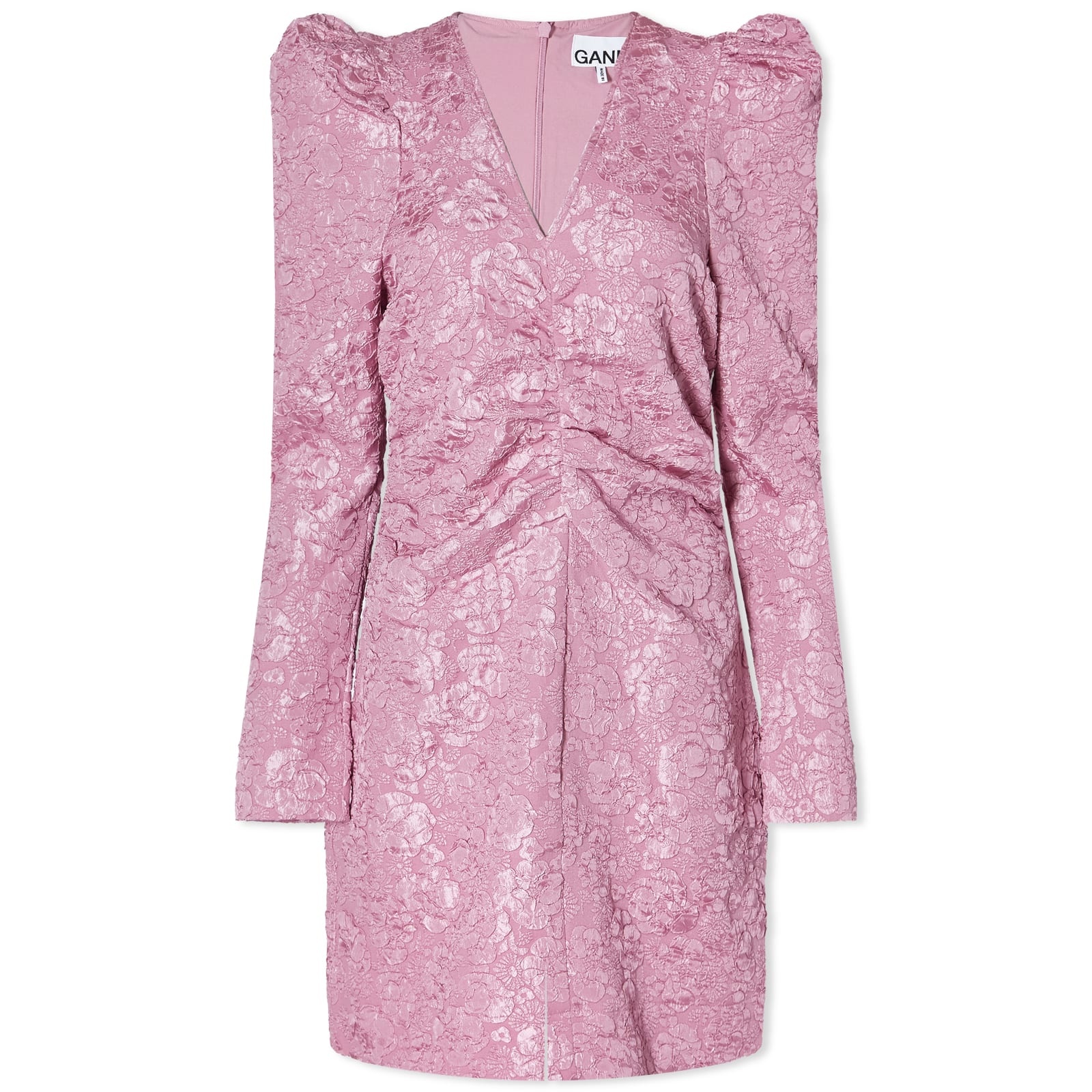 Ditch the little black dress this party season, and opt for GANNI’s romantic reimaging instead with this Stretch jacquard v-neck mini dress. Carrying on the brand’s mission to become the most responsible version of itself, this elegant design is structured with exaggerated puff sleeves to create a statement silhouette - while ruched details decorated both front and sides. - 55% Recycled Polyester, 45% Polyester - Mini Length - V-Neck - Zip Closure