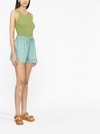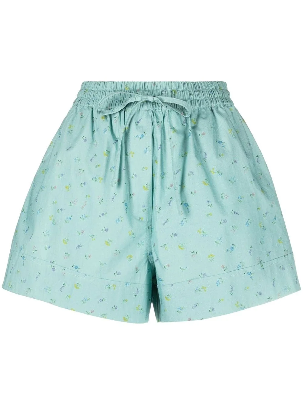floral-print flared shorts GANNI infuses a playful aesthetic in these organic cotton shorts, decorated with a delicate floral print and standing out with a voluminous flared silhouette. Highlights - Turquoise blue-green/multicolour - Organic cotton - All-over floral print - High waist - Elasticated drawstring waistband - Flared - Thigh-length Imported Composition Organic Cotton 100% SIZE & FIT Model measurements Height 5 ft 10 in(1.77 m) Bust/Chest 32.67 in(83 cm) Hips 35.43 in(90 cm) Waist 23.62 in(60 cm) FittingInformation This piece fits true to size. We recommend you get your regular size Designed to be fitted at the waist, loose over the leg Made with a lightweight non-stretch fabric