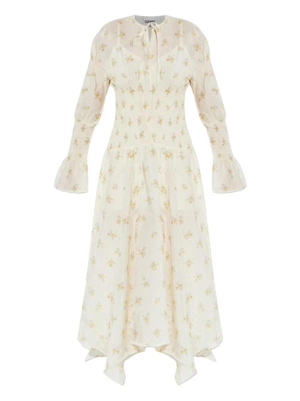 floral-print maxi dress Highlights - White - Self-tie fastening - Elasticated panelling - Bell sleeves - Asymmetric hem Imported Composition Viscose 100%