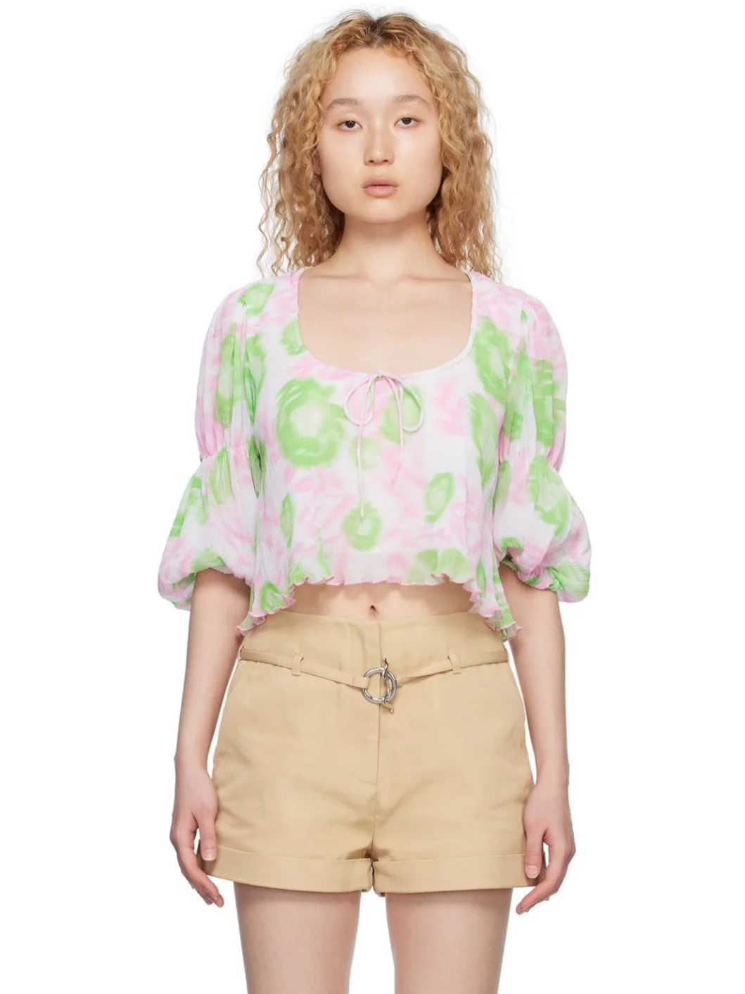 Garment-pleated recycled polyester georgette blouse. Graphic pattern printed throughout. · Self-tie strap at scoop neck · Lettuce edge at hem · Balloon sleeves · Elasticized cuffs · Partially lined Supplier color: Pink tulle Body: 100% recycled polyester. Lining: 100% recycled polyester. Made in India 231144F107033