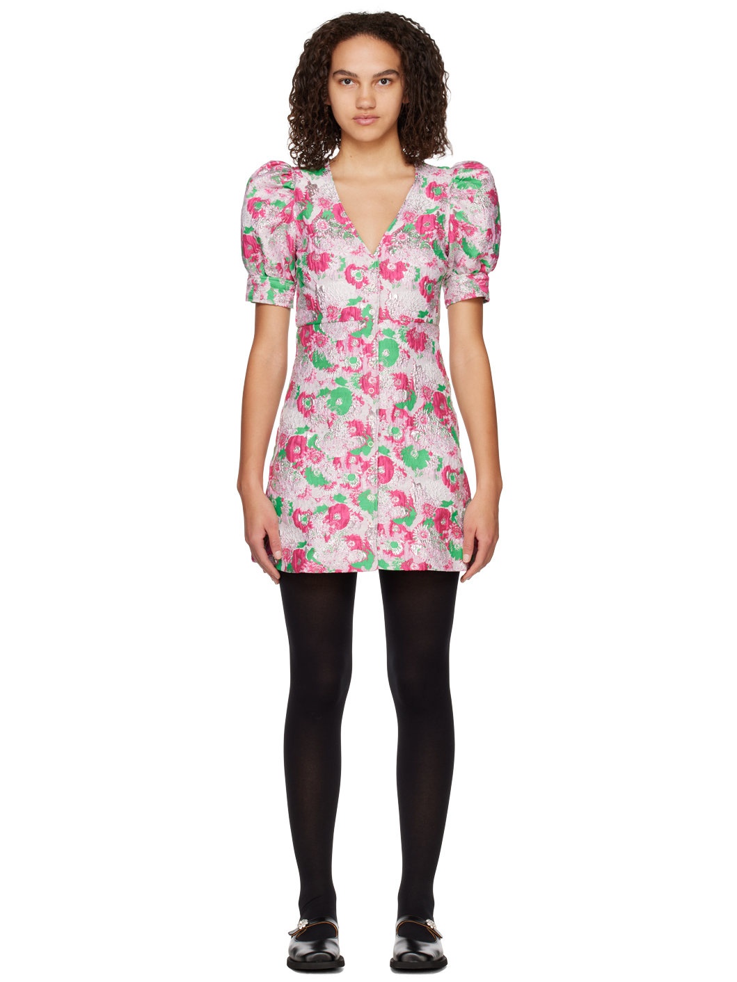 Recycled polyester-blend gobelin dress. Jacquard floral pattern and metallic thread detailing throughout. · V-neck · Press-stud closure · Puff sleeves · Press-stud fastening at barrel cuffs · Unlined Supplier color: Sugar plum