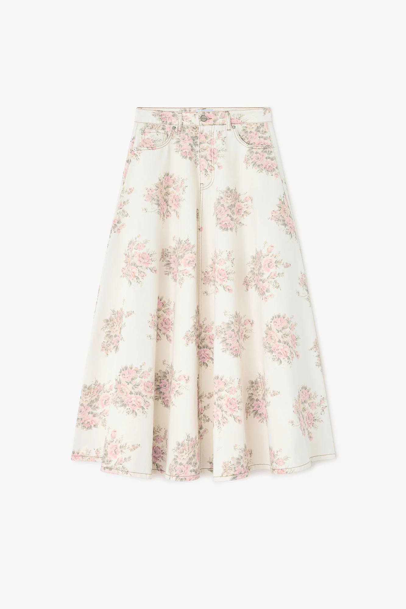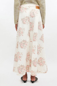 This skirt in floral printed denim feature a zip and button closure, 5 pockets, belt loops and a GANNI logo patch on back pocket. DETAILS - 100% organic cotton. Learn more about our materials - Lining composition: 100% Organic Cotton - Floral printed denim - Button and zip closure - Belt loops - 5 pockets - GANNI logo patch at back pocket Made in: Turkey Product ID: J1908 SIZE & FIT - Regular fit - Maxi length - Ayesha is 5’9” and wears a size US 4 - For personalised guidance on sizing and fit, contact our Customer Service team - here - .