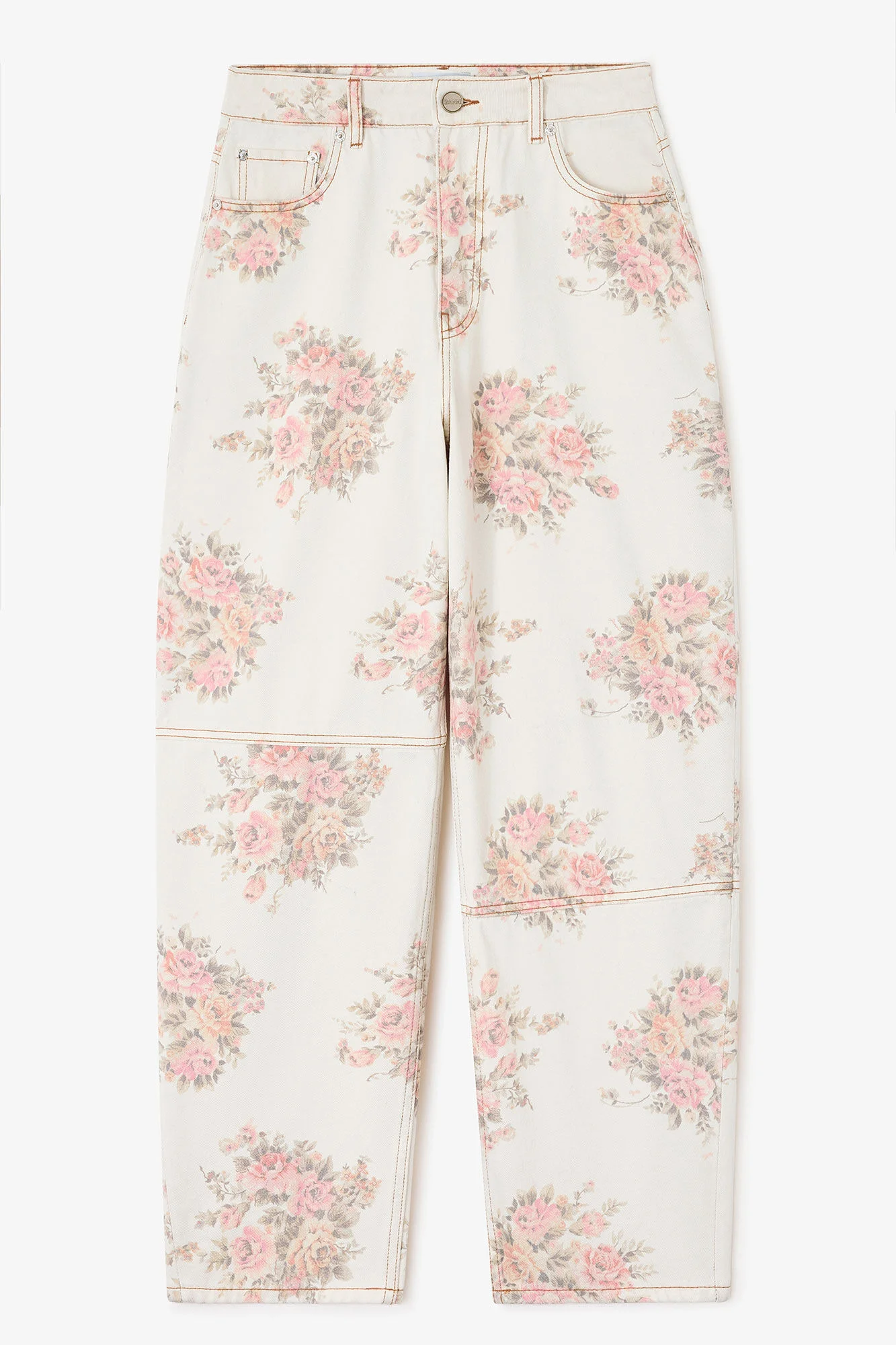 These jeans in floral printed denim feature a zip and button closure, 5 pockets, belt loops and a GANNI logo patch at back pocket. DETAILS - 100% organic cotton. Learn more about our materials - Lining composition: 100% Organic Cotton - Floral printed denim - Button and zip closure - Belt loops - 5 pockets - GANNI logo patch at back pocket Made in: Turkey Product ID: J1886 SIZE & FIT - Relaxed fit - Lena is 5’9” and wears a size 27 - For personalised guidance on sizing and fit, contact our Customer Service team - here - .