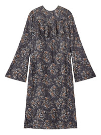 floral-print ruffled dress Highlights - Blue - Floral pattern - Ruffled neckline - Long sleeves - Bell sleeves Imported Composition Fabric 100% Washing instructions Read Manufacturer Guidelines