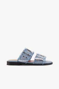 These Blue Denim Feminine Buckle Two-Strap Sandals feature two wide straps with silver-tone buckles and matching eyelets, an open-toe and a frayed hem. DETAILS - 100% recycled cotton. Learn more about our materials - Open-toe - Slip-in style - Two silver-tone buckles with eyelets Made in: Portugal Product ID: S2969