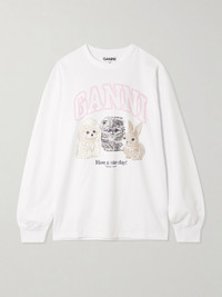GANNI's delightfully sweet sweatshirt is made from organic and recycled cotton-jersey in an oversized fit. It has classic ribbed trims and is printed with a kitten, puppy and bunny imploring you to 'Have a nice day! Please recycle'. Size & Fit - Fits true to size, take your normal size - Intended to be oversized; we recommend sizing down if you prefer a closer fit - Mid-weight, stretchy fabric - Model is 175cm/ 5'9" and is wearing a size Small Model measurements: - Bust: 82cm/ 32" - Waist: 65cm/ 26" - Hip: 92cm/ 36" Details & Care - Multicolored organic and recycled cotton-jersey - Slips on - 50% organic cotton, 50% recycled cotton - Unlined - Machine wash