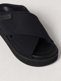 Descrizione - Contemporary design - Urban style - Slip on - Round and open toe - Padded criss-cross bands in fabric - Rubber application with logo - Interior in smooth leather - Logo embossed on the insole - Rubber sole - Welt stitching DETAILS AND CARE Composition 100% Tessuto, 100% Pelle di Vitello, 100% Gom SIZE AND FIT Sizes Heel: 3,2 cm Designer code: S1965 099 Giglio Code: D84099 Designer: Ganni Collection: Ganni Woman Category: Shoes Ganni