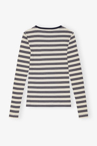 This Striped Soft Cotton Rib Long Sleeve T-Shirt features a round neckline, long sleeves and a GANNI Butterfly logo. DETAILS - 95% organic cotton, 5% elastane. Learn more about our materials - Round neckline - Long sleeves - GANNI Butterfly logo Made in: Portugal Product ID: T4145 SIZE & FIT - Elvina is 5’11” and wears a size S