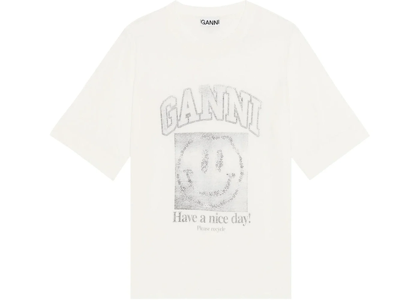 Ganni Womens Smiley O-neck Mid Sleeve Light Cotton Jersey T-shirt White