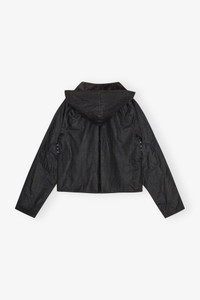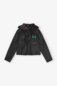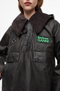 Now in its third season, GANNI x Barbour celebrates the craftsmanship and traditions of both brands. Capturing Barbour's British countryside heritage through waxed fabrics and tartan trims, infused with the energetic spirit of GANNI's hometown, Copenhagen. This collaboration reimagines countryside-inspired outerwear and accessories with a bold twist. Crafted from certified organic waxed cotton and recycled polyamide. Inspired by the details of Barbour's Spey waxed jacket, the GANNI x Barbour Tartan Waxed Anorak puts a Scandi spin on Barbour's signature waxed cotton outerwear. This half-zip anorak jacket features a contrasting classic Barbour Tartan and grey Winter Tartan profile with GANNI's iconic oversized collar in Barbour's chunky corduroy to finish. Complete with the Barbour GANNI signature silicone badge to the chest, this style is a must-have. DETAILS - 100% organic cotton. Learn more about our materials - Lining composition: Outer: 100% Cotton Inner: 65% Polyester 35% Cotton - Half-zip closure - Detachable hood - Oversized collar - Flap pockets at the front - Side pockets - GANNI x Barbour silicone badge at the chest Made in: Moldova Product ID: F9753 SIZE & FIT - Regular fit - Noor is 5’11” and wears a size US 4