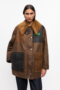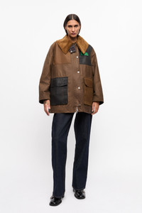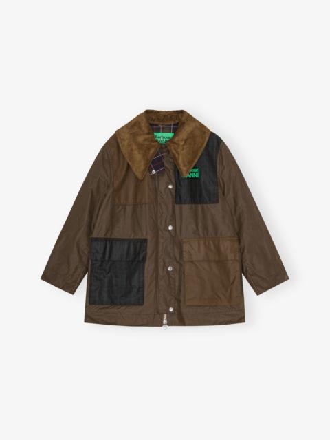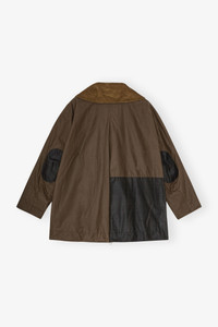 Now in its third season, GANNI x Barbour celebrates the craftsmanship and traditions of both brands. Capturing Barbour's British countryside heritage through waxed fabrics and tartan trims, infused with the energetic spirit of GANNI's hometown, Copenhagen. This collaboration reimagines countryside-inspired outerwear and accessories with a bold twist. Crafted from certified organic waxed cotton and recycled polyamide. Welcoming a new silhouette, the GANNI x Barbour Waxed Duffle Coat is perfect for the colder seasons. Crafted from Barbour's signature waxed cotton, this style features contrasting patchwork with the archival grey Winter Tartan at the body and elbow patches. It's complete with GANNI's signature oversized collar, finished with Barbour corduroy and signed off with the co-branded silicone patch at the chest. DETAILS - 100% organic cotton. Learn more about our materials - Lining composition: Outer: 100% Cotton Inner: 65% Polyester 35% Cotton - Full zip closure with snap-button placket - Oversized corduroy collar - Large front patch pockets - Elbow patches - GANNI x Barbour silicone badge at the chest Made in: Moldova Product ID: F9754 SIZE & FIT - Oversized fit - Renda is 5’10” and wears a size US 4