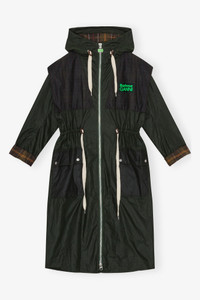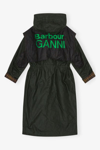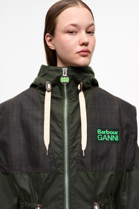 Now in its third season, GANNI x Barbour celebrates the craftsmanship and traditions of both brands. Capturing Barbour's British countryside heritage through waxed fabrics and tartan trims, infused with the energetic spirit of GANNI's hometown, Copenhagen. This collaboration reimagines countryside-inspired outerwear and accessories with a bold twist. Crafted from certified organic waxed cotton and recycled polyamide. The GANNI x Barbour Waxed Parka Jacket offers a seamless blend of Barbour's timelessly functional outerwear and GANNI's Scandi aesthetic. Crafted from Barbour's signature waxed cotton, it's complemented with contrasting yoke panels and elbow patches in Barbour's Classic Tartan. It's complete with a bold rendition of the Barbour GANNI logo on the reverse. DETAILS - 100% organic cotton. Learn more about our materials - Lining composition: Outer: 100% Cotton Inner: 65% Polyester 35% Cotton - Zip closure with dual zippers - Drawstring waist for an adjustable fit. - Hood with drawstrings for a secure fit - Large front flap pockets with snap closures - Folded cuffs with plaid lining - GANNI x Barbour silicone badge at the chest - GANNI x Barbour logo on the back Made in: Moldova Product ID: F9756 SIZE & FIT - Oversized fit - Noor is 5’11” and wears a size US 4