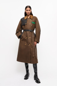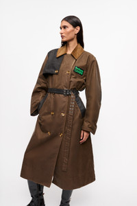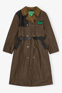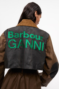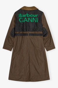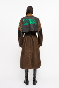 Now in its third season, GANNI x Barbour celebrates the craftsmanship and traditions of both brands. Capturing Barbour's British countryside heritage through waxed fabrics and tartan trims, infused with the energetic spirit of GANNI's hometown, Copenhagen. This collaboration reimagines countryside-inspired outerwear and accessories with a bold twist. Crafted from certified organic waxed cotton and recycled polyamide. Featuring a seamless blend of Barbour's signature silhouettes and GANNI's iconic details, the GANNI x Barbour Waxed Trench Coat is a fusion of both brands' signature aesthetics. Crafted from Barbour's signature waxed cotton and complemented by patches of Classic Tartan, this trench coat features GANNI's cocoon sleeves and signature buckle detail. It's finished with bold Barbour GANNI logo embroidery on the reverse. DETAILS - 100% organic cotton. Learn more about our materials - Lining composition: Outer: 100% Cotton Inner: 65% Polyester 35% Cotton - Button-up closure with additional belted waist - Corduroy collar - Side pockets with black detailing - Elbow patches - Contrast paneling on shoulders and back - GANNI x Barbour silicone badge at the chest Made in: Moldova Product ID: F9757 SIZE & FIT - Regular fit - Renda is 5’10” and wears a size US 4