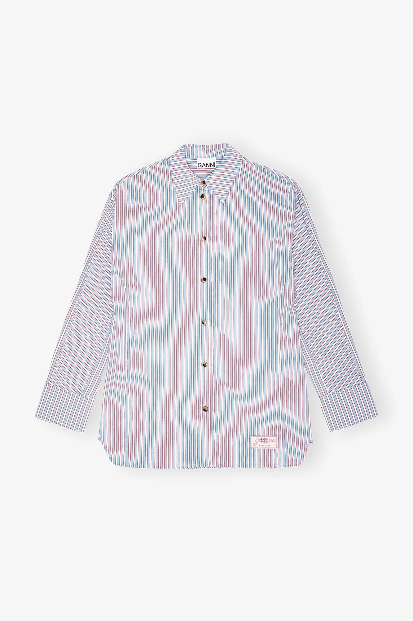 This Candy Striped Shirt features a collar, a button closure at the front, long sleeves and a sewn-on GANNI logo patch. DETAILS - 81% LENZING™ ECOVERO™ viscose, 19% polyamide. Learn more about our materials - Collar - Long sleeves - Button closure - Sewn-on GANNI logo patch Made in: India Product ID: W0312 SIZE & FIT - Relaxed fit - Fia is 5’11” and wears a size US 4