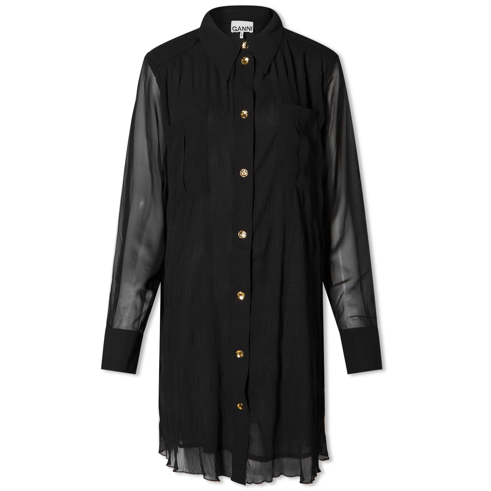 GANNI creates contemporary fashion with a Copenhagen-cool state of mind. We're fan-girling over the Georgette Shirt Dress. It's a fun spin on the classic little black dress, crafted from crinkle pleated fabric that's floaty and light while sheer sleeves and gold-tone buttons draw the eye in. - 100% Recycled Polyester - Button Closure & Cuffs - 2 Chest Pockets - Sheer Sleeves - Machine Wash Cold