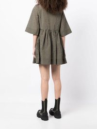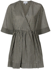 gingham-print seersucker minidress GANNI's playful aesthetic is defined by the brand's effortless take on the classics, updating them with a cool Scandinavian eye. Cut for a playful smock silhouette, this dress is adorned with a muted take on gingham for AW22. Highlights - Brown - Organic cotton-recycled polyester blend - Fine check print - Seersucker texture - Wrap design - V-neck - Long sleeves Imported Composition Organic Cotton 44%, Recycled Polyester 43%, Polyamide 13% SIZE & FIT Model measurements Height 5 ft 10 in(1.78 m) Bust/Chest 33.46 in(85 cm) Hips 35.43 in(90 cm) Waist 24.4 in(62 cm) FittingInformation This piece fits true to size. We recommend you get your regular size Cut for a loose fit Made with a mid-weight non-stretch fabric Washing instructions Machine Wash