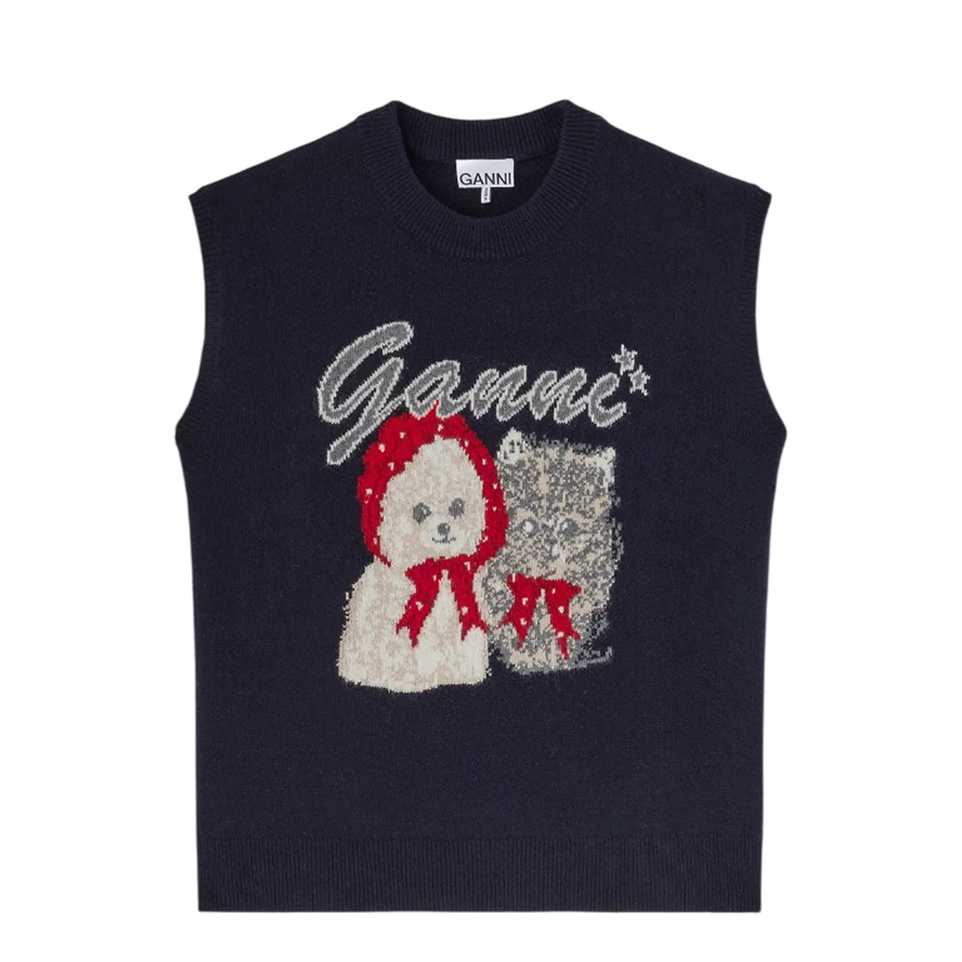 300049220BLU-XS / A5K2638/00/683 - Sleeveless vest design - Crew neckline with ribbed trim - Knitted puppy graphic with red hood detail - Metallic GANNI script lettering - Wool blend construction - Relaxed fit - Ribbed hem and armholes GANNI Graphic Wool Mix Vest delivers playful Danish design with cozy comfort and statement appeal. Crafted from soft wool blend in deep navy, featuring an adorable knitted puppy motif with festive red accents and metallic GANNI branding. The sleeveless silhouette and whimsical graphics create a charming layering piece that adds personality to any outfit.