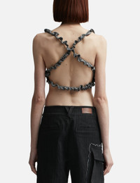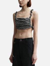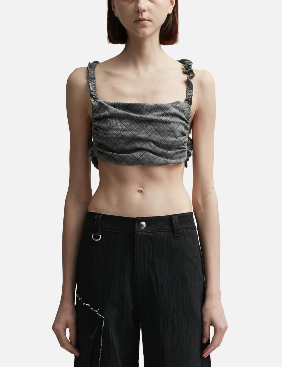 - Ganni - Gray Checkered Mix Ruched Top - Form-fitting silhouette - Soft and slightly stretchy fabric - Straight neckline - Ruffled straps - All-over checkered print - Color: Frost Gray - Material: 61% Recycled Polyester, 25% Viscose, 10% Wool, 4% Elastane - See more Tops and Clothing
