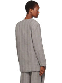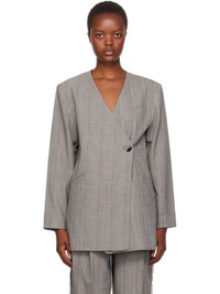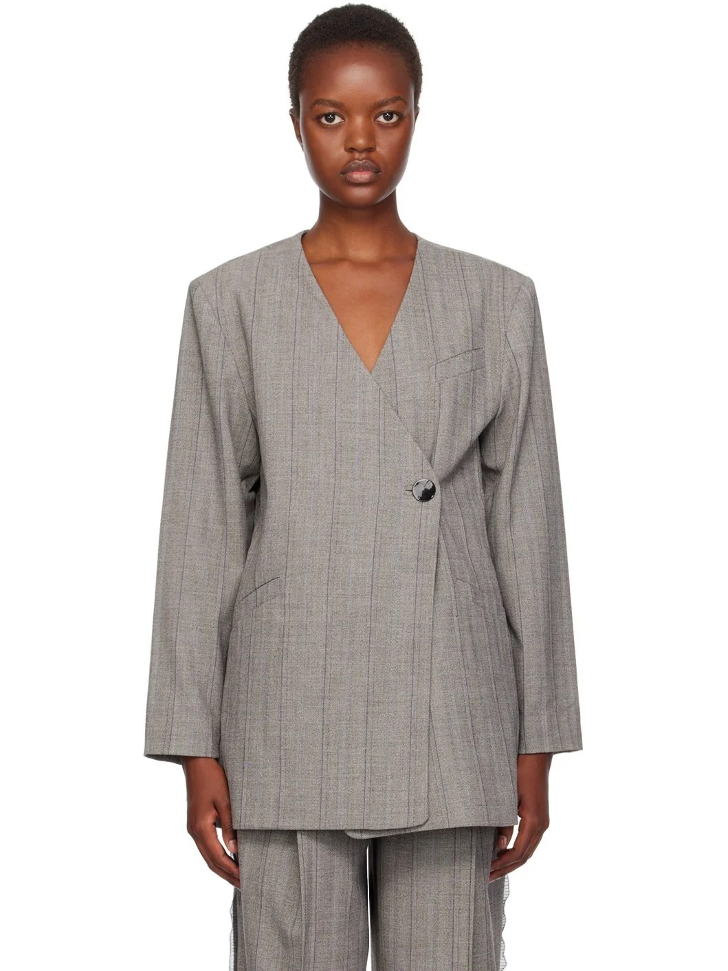Stretch LENZING™ ECOVERO™ viscose-blend herringbone blazer. · V-neck · Offset button closure · Welt pockets · Padded shoulders · Logo-woven satin lining Supplier color: Frost gray Body: 35% polyester, 33% recycled polyester, 29% viscose, 3% elastane. Lining: 100% polyester. Made in Turkey 232144F057024